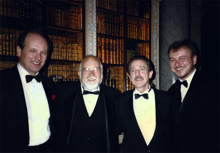 Philip Moores, post production supervisor for GRUMPUSS (right), has been a friend since he was a teenager, new to Hollywood in the early 70's. Second from right is GRUMPUSS music arranger and conductor David Carr, who, way back when, played in The Fortunes; (You've Got Your Troubles, I've Got Mine and Here Comes That Rainy Day Feeling, Again). David worked many sessions with Philip in Philip's Hollywood days, including the demo session for my songs from LONG-GRIN, which Philip engineered and David arranged. I knew Colin Sheen (left), was one of the top musicians' contractors in England, but had no idea that he and David Carr, who met for the first time on GRUMPUSS, both went to school at Christ's Hospital in Horsham and Colin was only one year behind David! What's more, early in Colin's career, he played trombone in the BBC Midland Light Orchestra in Birmingham, then conducted by Michael Moores, Philip Moores's dad! And when Peter Anderson (2nd from left), filmed the 70mm 3D production PIRATES with Leslie Neilson, Eric Idle and Adam Wylie for Busch Gardens/Sea World, Colin Sheen was the fixer for that session scored in London.