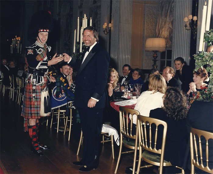 Pipe Major Stephen Duffy of the Caledonian Pipe Band played up a storm, marching round and round the long banquet table. At the conclusion of his stirring performance, the Marquis of Blandford (now 12th Duke of Marlborough), presented the traditional dram of whisky. The Marquis was an enthusiastic and gracious dinner guest whom I first met on the day before the event, during the lone rehearsal for the orchestra and gymnasts. Drawn by the music, the Marquis came out to the marquee. By then, the lighting and seats were in and the crew was hurrying to finish the woodland set. He watched the rehearsal with that same broad grin you see here and then asked me if it was too late to get an invitation to the premiere. Well, he's a charming fellow (and he lives there, after all), so I invited him straight away. "But you'll have to run down to Moss Bros," I admonished. Black Tie, you know. He laughed and said that he thought he might be able to find something appropriate in his closet. By now, you will recognize the rest of us, but look at Lynn Redgrave, all the way on the right, framed by the greenery. As brightly as she shone inSHINE she was absolutely radiant at the premiere. Now, that's star quality -- recognized publicly in January, 1999, when she received a Golden Globe Award for Best Actress in the film, GODS AND MONSTERS. P.S. The lovely young woman leaning in for a word with me is Wonkie Hills, the brilliant party coordinator who managed the entire World Premiere banquet for the Admirable Crichton and has since formed her own company, Zest Events. |