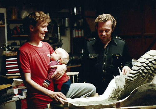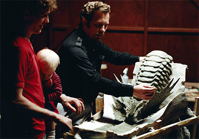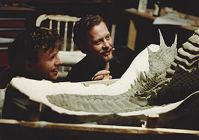 A SECOND VISIT WAS LIKE ENTERING THE WORLD TURNED UPSIDE DOWN. In the photo (left), the head is already in the mould. BIlly had turned it over to work on the neck, its all-important voice box and air bladders, designed to inflate (with a soft hiss), whenever Long-Grin was about to speak. The "wattle" in the vicinity of what might be considered an Adam's apple in a man, was to be the dragon's voice box, intended to move as the dragon spoke and formed his words. The two air bladders were properly placed on either side of the wattle. Billy's realization of the concept was nothing short of inspired, and although none of these elements functioned in the model, it was clear how they would be utilized and operated by the puppeteers, once servos and wires were in place. This upside down view takes a minute or two to get used to, but ultimately made sense. In Billy's 17-part mould, the plaster-like material would harden. Then Billy would take it apart and dig out the clay. Sincerely interested, Travis paid close attention, but he later admitted he thought Billy's baby Tyler understood it about as well as he did, and Tyler didn't even pretend to be interested. He had complete confidence in his Dad, which might have been more reassuring had Tyler been awake, but at the end of the day, it didn't matter if either of them understood the process, as long as Billy did.  |